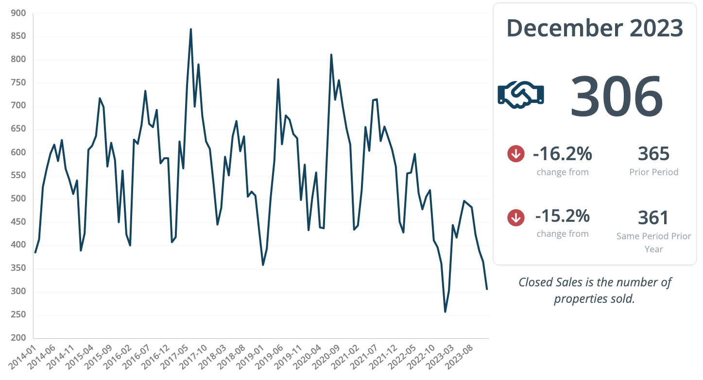 Sold homes reached 306 for the month of December, down 16.2% from November and down 15.2% from December 2022.