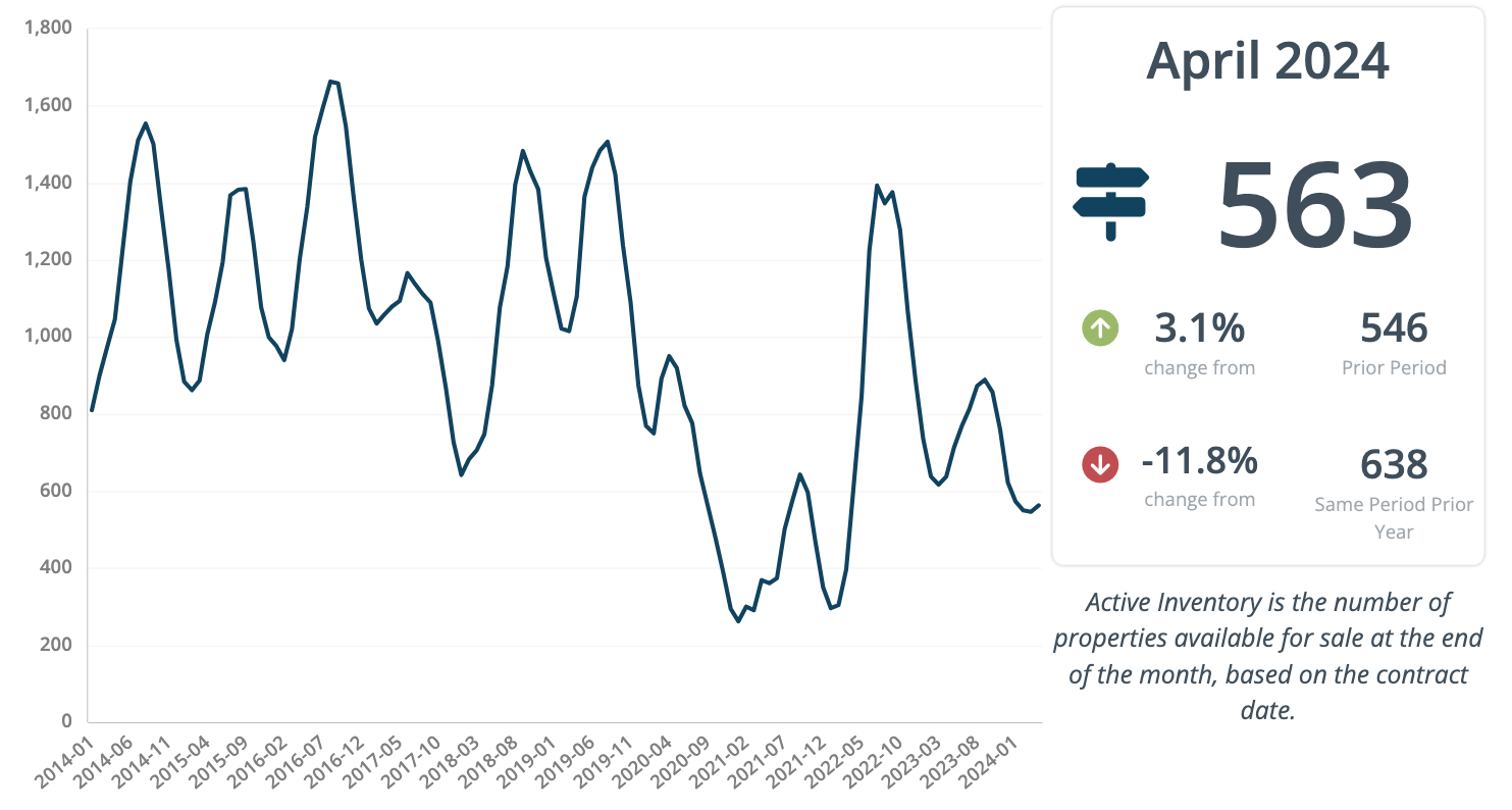 The active inventory of homes in February reached 563, up 3.1% from March. This is down 11.8% from April 2023.