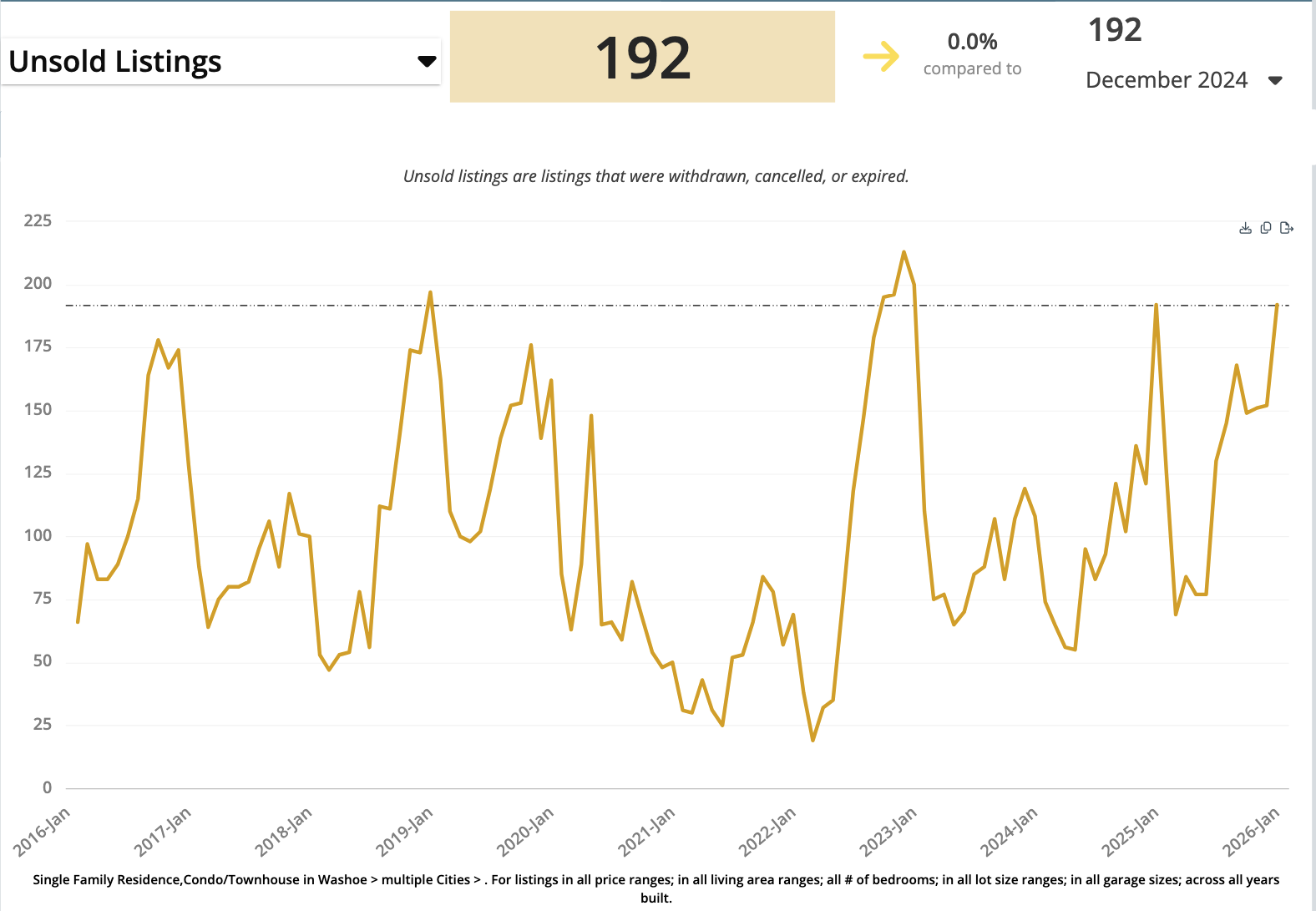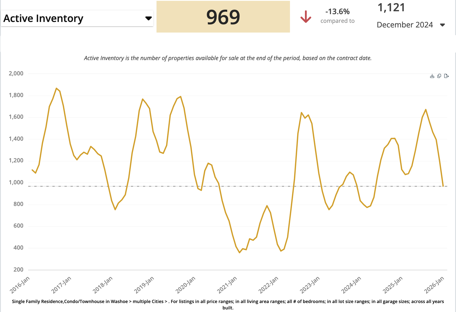 While the year-over-year improvement is positive, the bigger picture is more concerning. Total sales for all of 2025 came in at 5,692 homes — well below the historical average of 6,500 to 7,500 annual sales for the Reno–Sparks area.