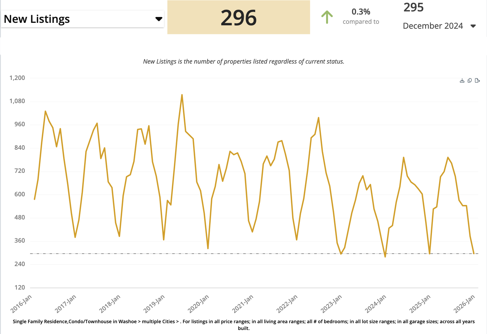 In December 2025, 296 new listings came on the market — essentially unchanged from the 295 listings recorded in December 2024.