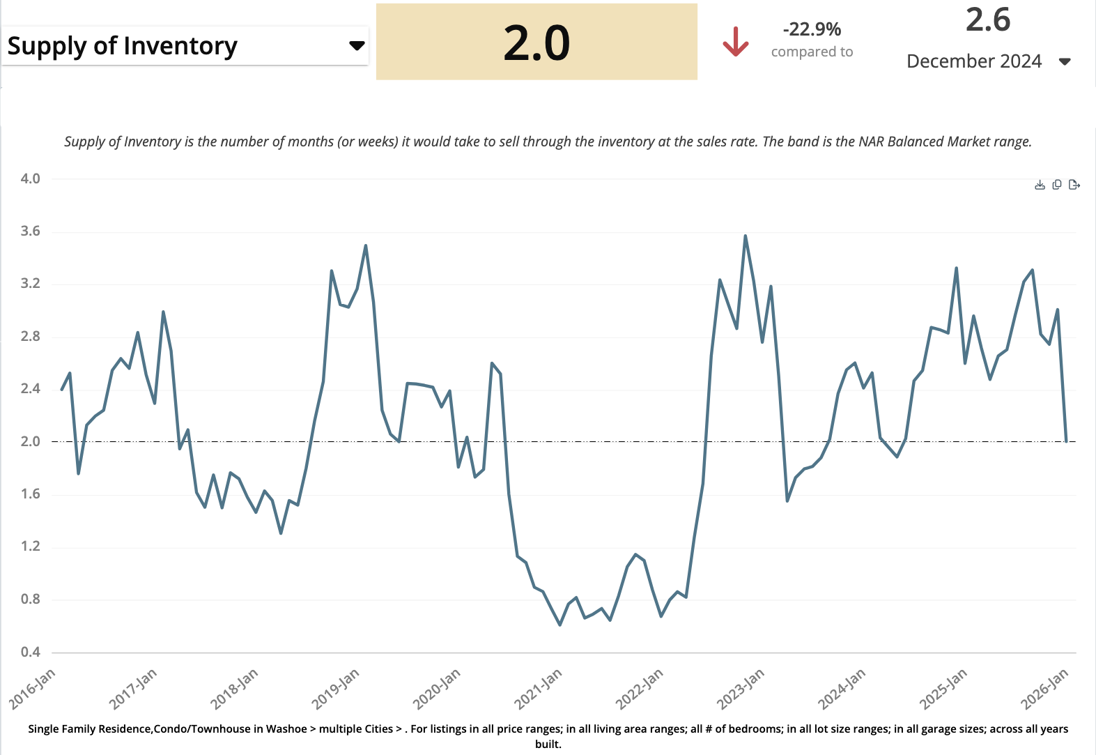 A balanced housing market typically sits closer to 3.5 months of supply, while numbers above five months often signal slowing conditions. That said, lower supply is common during winter months, so this figure is not unusual for this time of year.