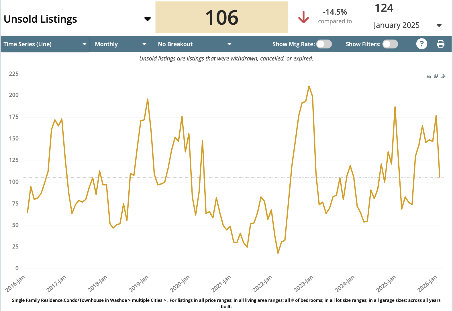 There were 106 unsold listings in January — homes that were listed but did not sell — down 14.5% from last year’s 124.