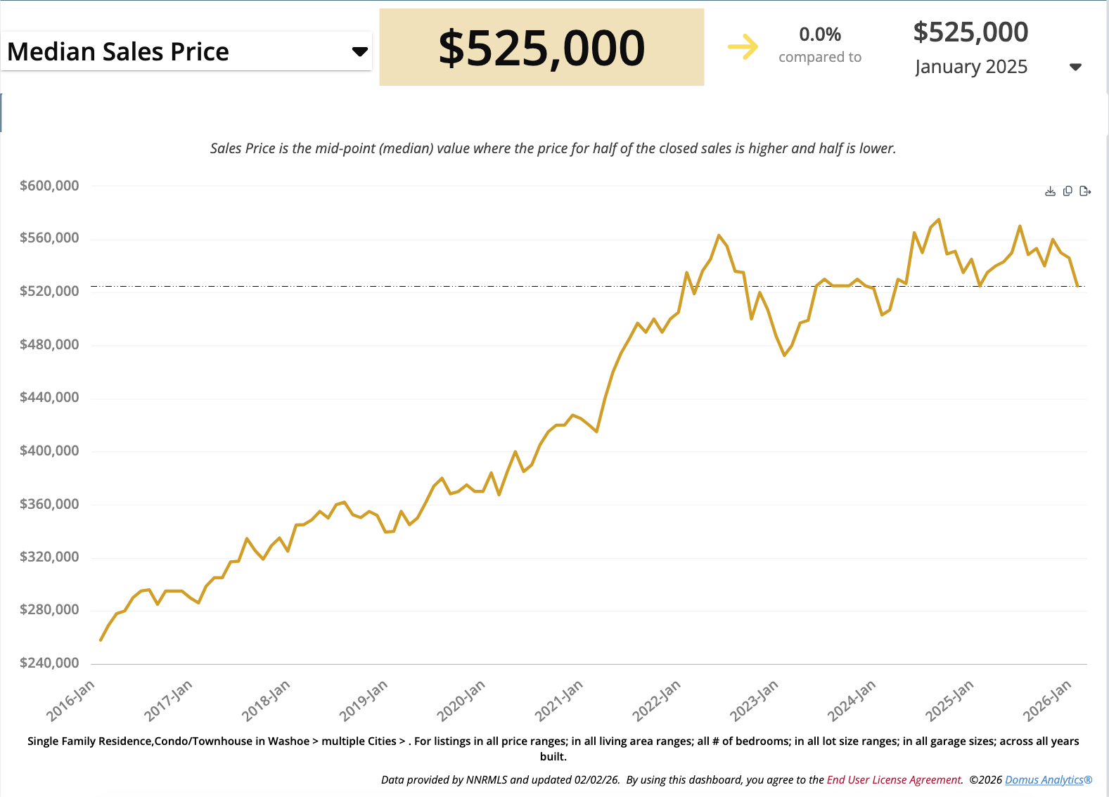 The median home price in Reno–Sparks currently stands at $525,000, unchanged from this time last year.
