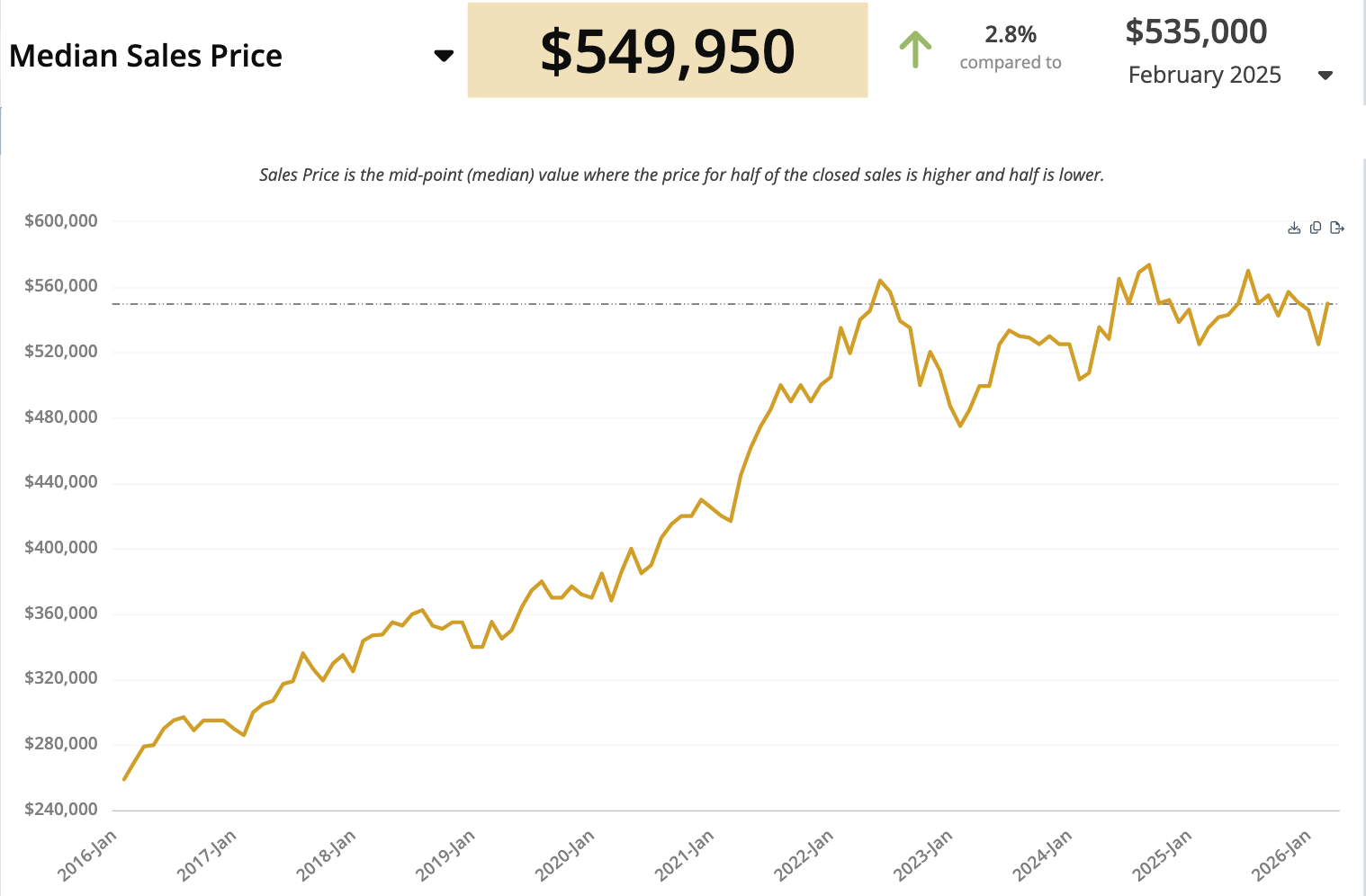 The median home price in Reno–Sparks is now $549,950, up 2.8% year over year.