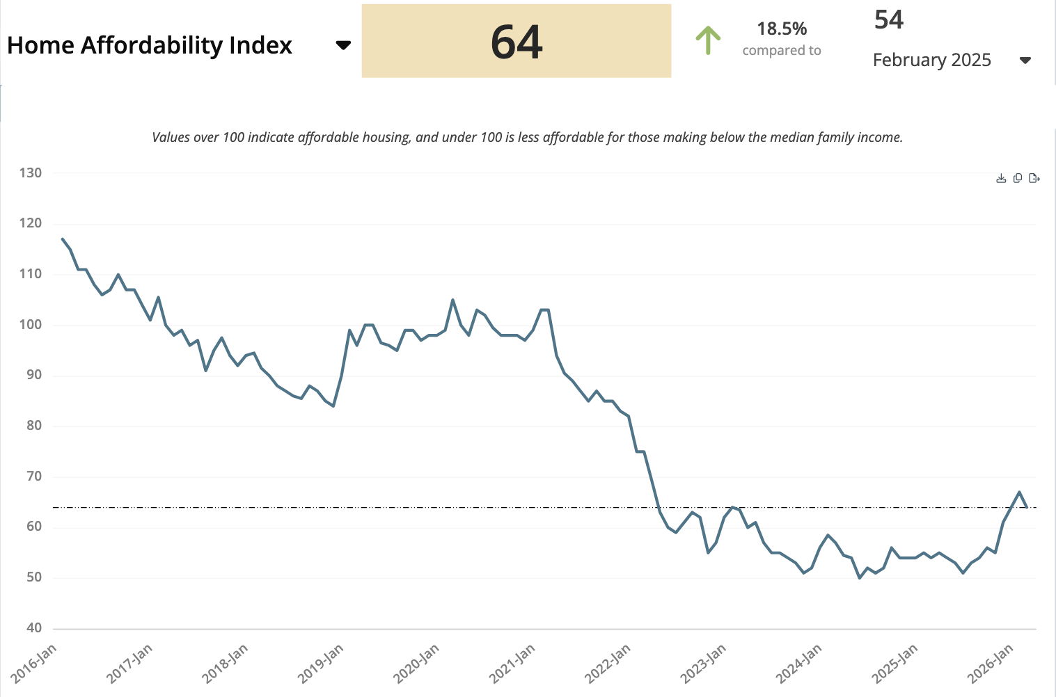 The affordability index currently sits at 64, up 18.5% from last year’s 54.